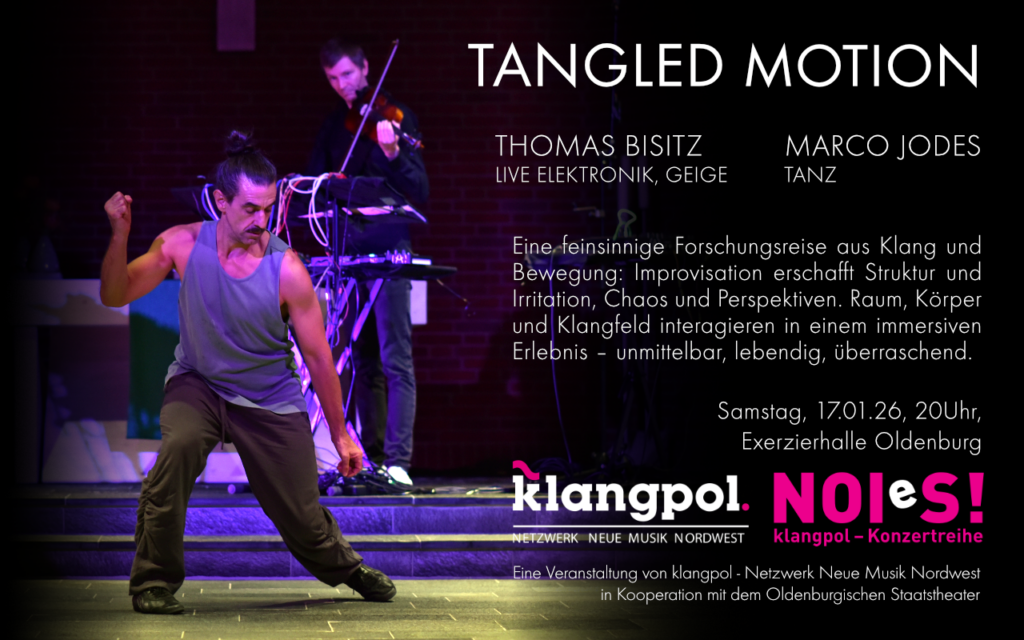 Der Oldenburger Klangkünstler Thomas Bisitz und der Mainzer Tänzer Marco Jodes erforschen seit rund zehn Jahren in gemeinsamer Improvisation das Zusammenspiel von Klang, Bewegung, Raum und Publikum. In dem immersiven Klangfeld verweben sich Körper und Raum zu einem feinsinnigen Spiel aus Bezug und Irritation, Struktur und Chaos – unmittelbar, berührend, lebendig, überraschend.
